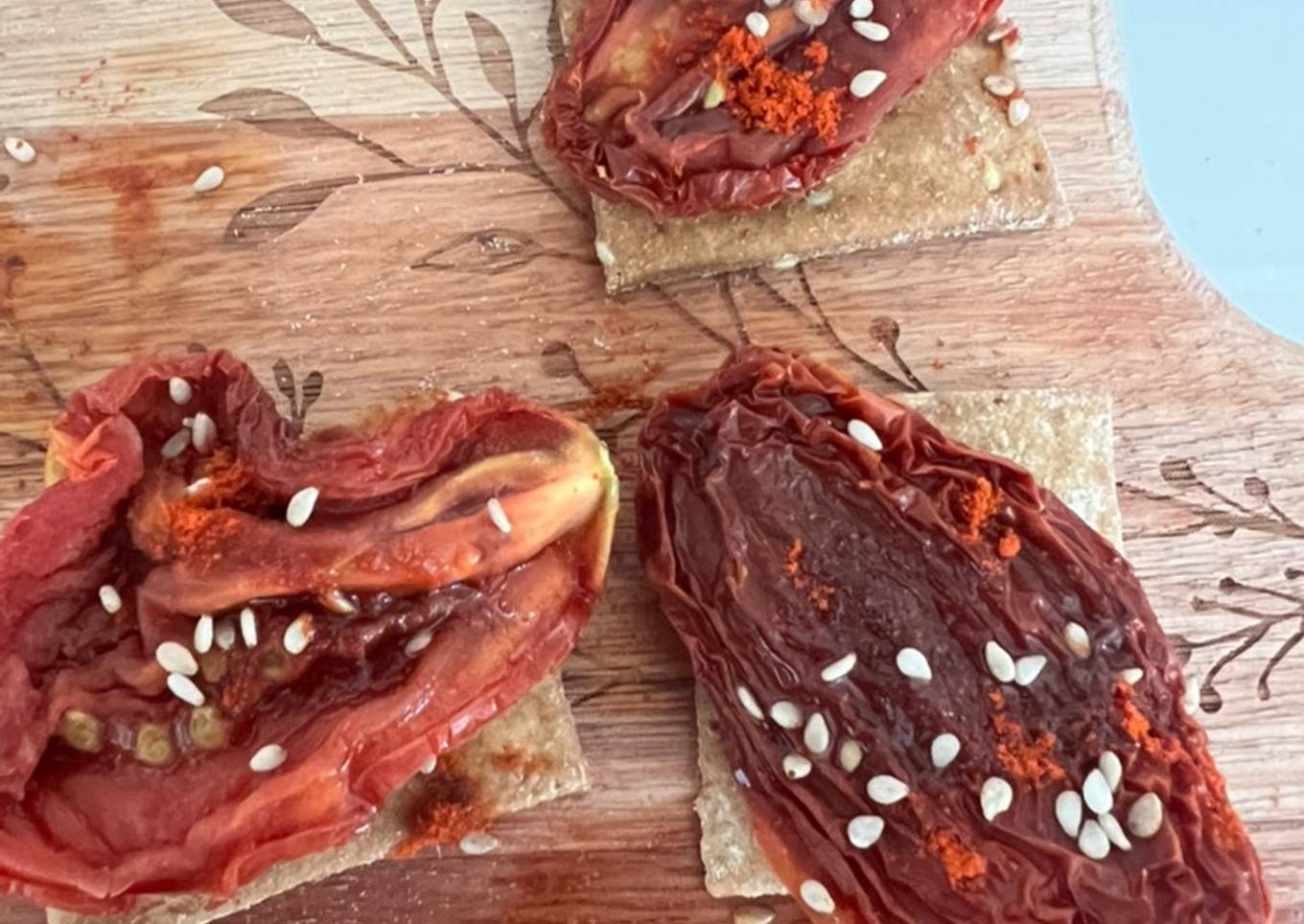 Tostaditas de tomates secos, oliva, pimentón ahumado y sésamo (picada rica y saludable)