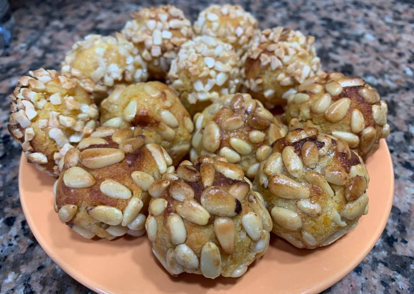 - Dividir la masa en 12 bolitas, rebozar unas con piñones y otras con almendra picada