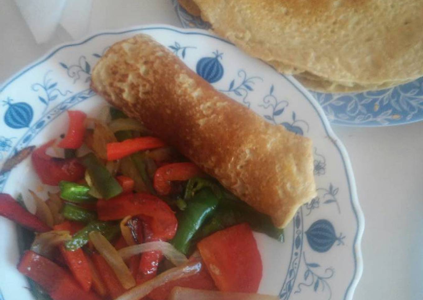 - Servimos los crepes en un plato y las verduras en otro y cada comensal se hace su propio rollito. Opcional : antes de enrollar el crepe con la verdura aderezamos con mayonesa de tofu (receta anterior) así queda mucho más sabroso.