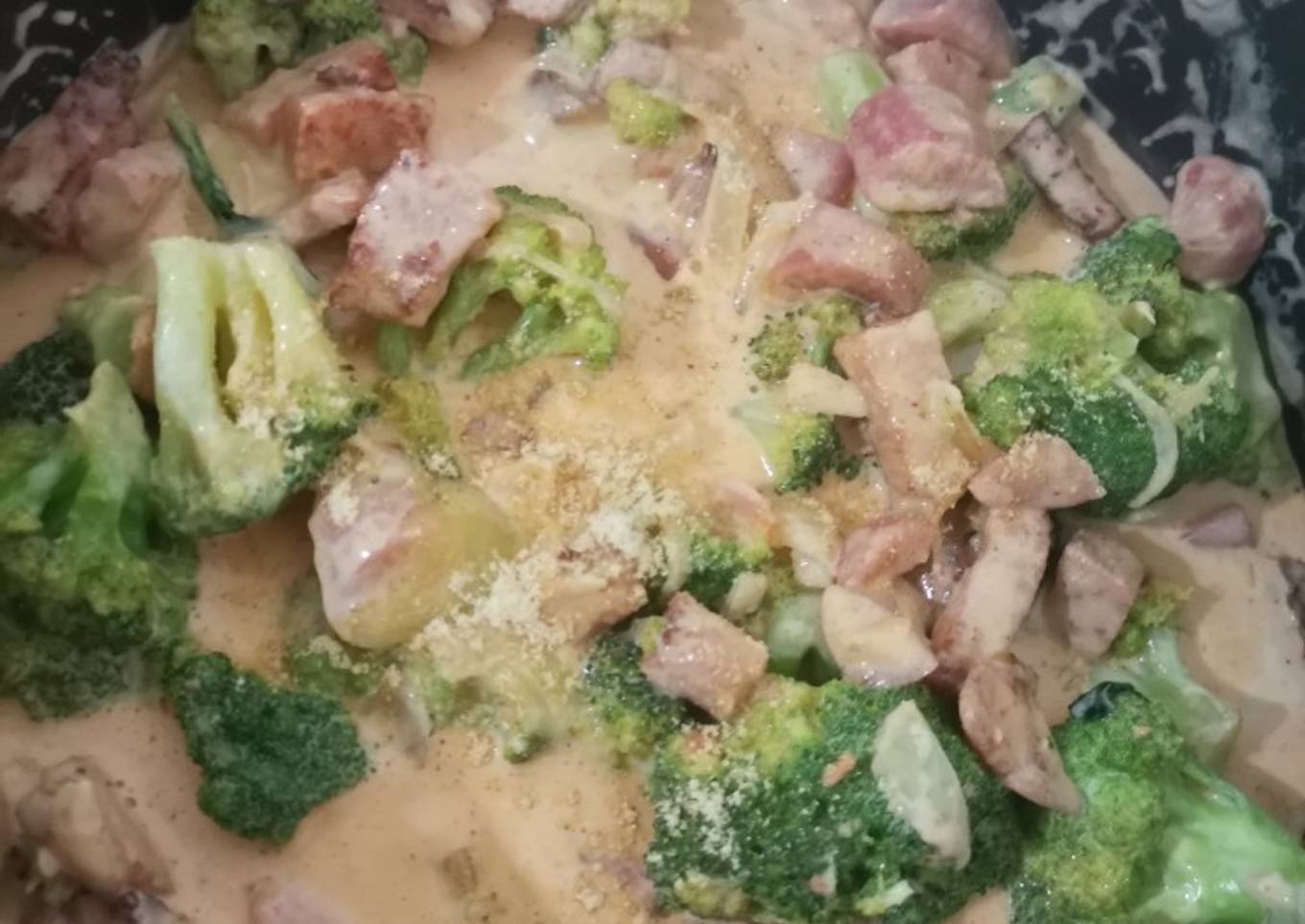 Steps to make to make Salchichas y chuleta en crema de chipotle con brócoli